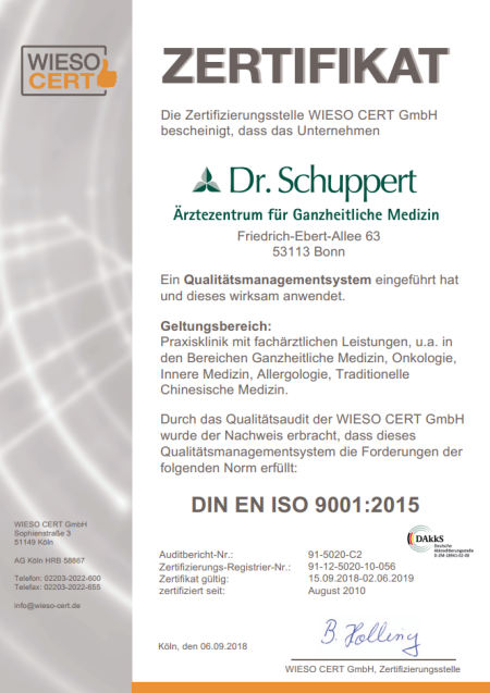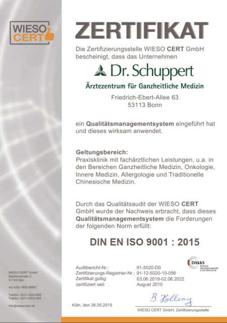 Das Dr. Schuppert Ärztezentrum für Ganzheitliche Medizin hat sein Qualitätsmanagement auf die neue Norm DIN EN ISO 9001 erfolgreich aktualisiert und das Qualitätsmanagement-Zertifikat wurde erneut verliehen.